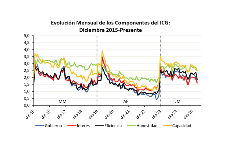 A este panorama económico se suma un clima político tenso con gobernadores y el Congreso, lo que amplifica la percepción de fragilidad institucional. Los componentes del índice reflejan este malestar: el subíndice de Eficiencia fue el que más cayó, con un desplome del 21,4%, seguido por la Evaluación general del gobierno (-17,2%) y la Preocupación por el interés general (-13,9%).