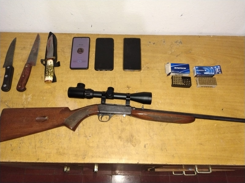 Durante la requisa, los efectivos encontraron dos guanacos ya faenados, especie protegida cuya caza está prohibida. Además, secuestraron una carabina calibre .22 que estaba lista para ser utilizada, con municiones tanto en el cargador como en la recámara.